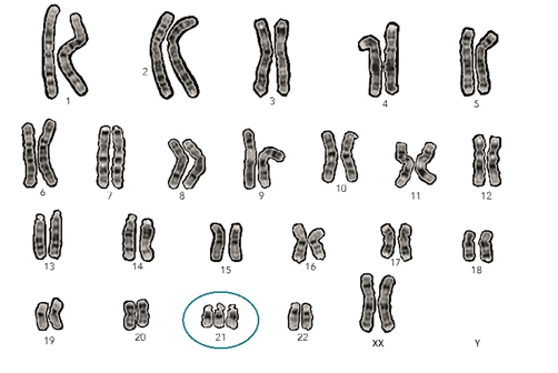 - ภาวะ Down syndrome เกิดจากความผิดปกติของโครโมโซมคู่ที่ 21 (Trisomy 21)เกินมา 1 แท่ง ส่งผลให้ทารกมีพัฒนาการทั้งด้านร่างกายและสติปัญญาช้ากว่าปกติ กลุ่มอาการดาวน์ซินโดรมจะมีลักษณะใบหน้าบางอย่างเฉพาะตัว เช่น ใบหน้าแบนราบ จมูกแบน ตาเฉียงขึ้น คางเล็ก และอาจมีความพิการแต่กำเนิดอื่นๆ เช่น ความผิดปกติของหัวใจ มีภาวะต่อมไทรอยด์บกพร่อง ปัจจุบันยังไม่มีการรักษาให้หายขาด แต่สามารถรักษาตามอาการและให้การดูแลเพื่อส่งเสริมคุณภาพชีวิตได้ดีขึ้น