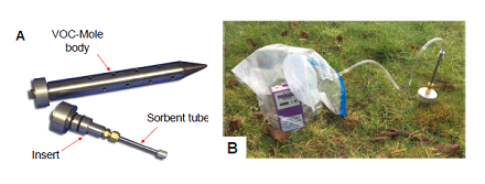 อุปกรณ์ที่ใช้ในการเก็บตัวอย่าง VOCs ในดินด้วยเทคนิค Passive (A) และ Active (B)