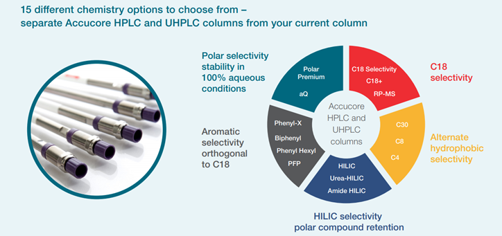นอกจากข้อดีในแง่ประสิทธิภาพการวิเคราะห์ที่กล่าวไปข้างต้นแล้ว Accucore Column ยังมี Bonded Phases ที่หลากหลาย เช่น C18, aQ, HILIC, Phenyl Hexyl เพื่อให้ผู้ใช้งานได้เลือกใช้เพื่อเพิ่มความจำเพาะต่อกลุ่มสารในตัวอย่างที่ต้องการวิเคราะห์ (รูปที่ 5) และยังคงรองรับการใช้งานได้ทั้งบนเครื่อง HPLC และ UHPLC System จึงทำให้ Thermo Scientific™ Accucore™ LC column เป็นที่รู้จักอย่างรวดเร็วและได้รับความสนใจจากผู้ใช้งานจำนวนมากในปัจจุบัน