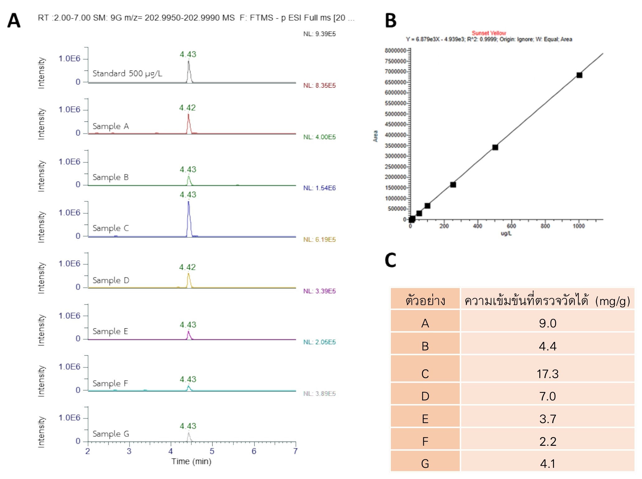 Sunset Yellow FCF ในผงชาไทยสามารถทำได้อย่างแม่นยำด้วยเทคนิค Liquid Chromatography-Mass Spectrometry (LC-MS) ชนิด LC-Q-Orbitrap ซึ่งเป็นเครื่องมือที่มีความไว (Sensitivity) และความจำเพาะสูง (Selectivity) ทำให้สามารถตรวจวัดปริมาณสารได้แม้มีความเข้มข้นในระดับไมโครกรัมต่อลิตร (µg/L) จากผลการประยุกต์ใช้วิธีการนี้กับตัวอย่างผงชาไทย 7 ตัวอย่างที่เก็บจากท้องตลาด พบว่ามีปริมาณ Sunset Yellow FCF อยู่ในช่วง 2.2–17.3 มิลลิกรัมต่อกรัม (mg/g) ของผงชา ซึ่งผลการวิเคราะห์นี้ชี้ให้เห็นว่าสามารถนำไปใช้เป็นข้อมูลเพื่อสนับสนุนด้านมาตรฐานความปลอดภัยอาหารและคุ้มครองผู้บริโภคได้